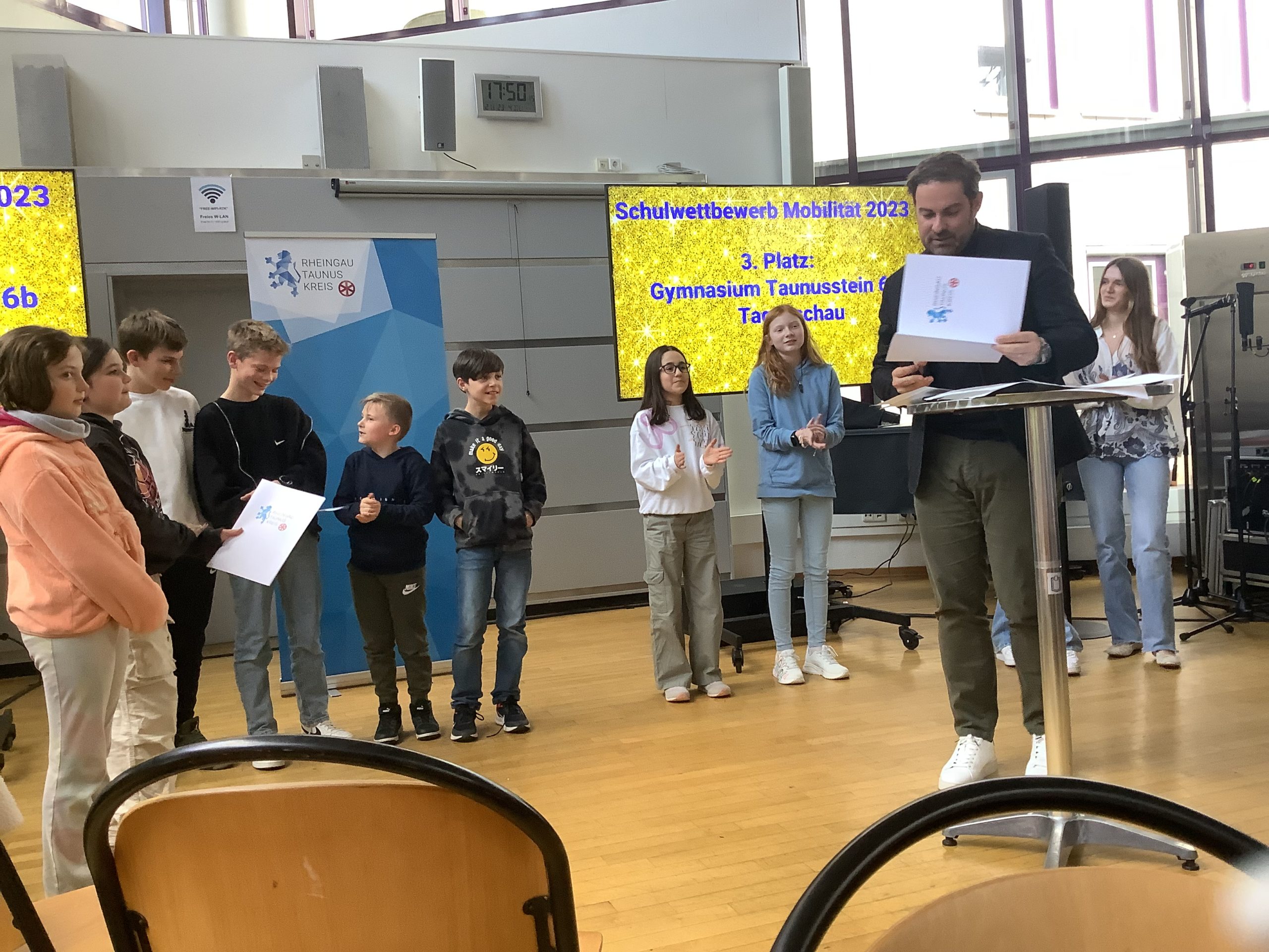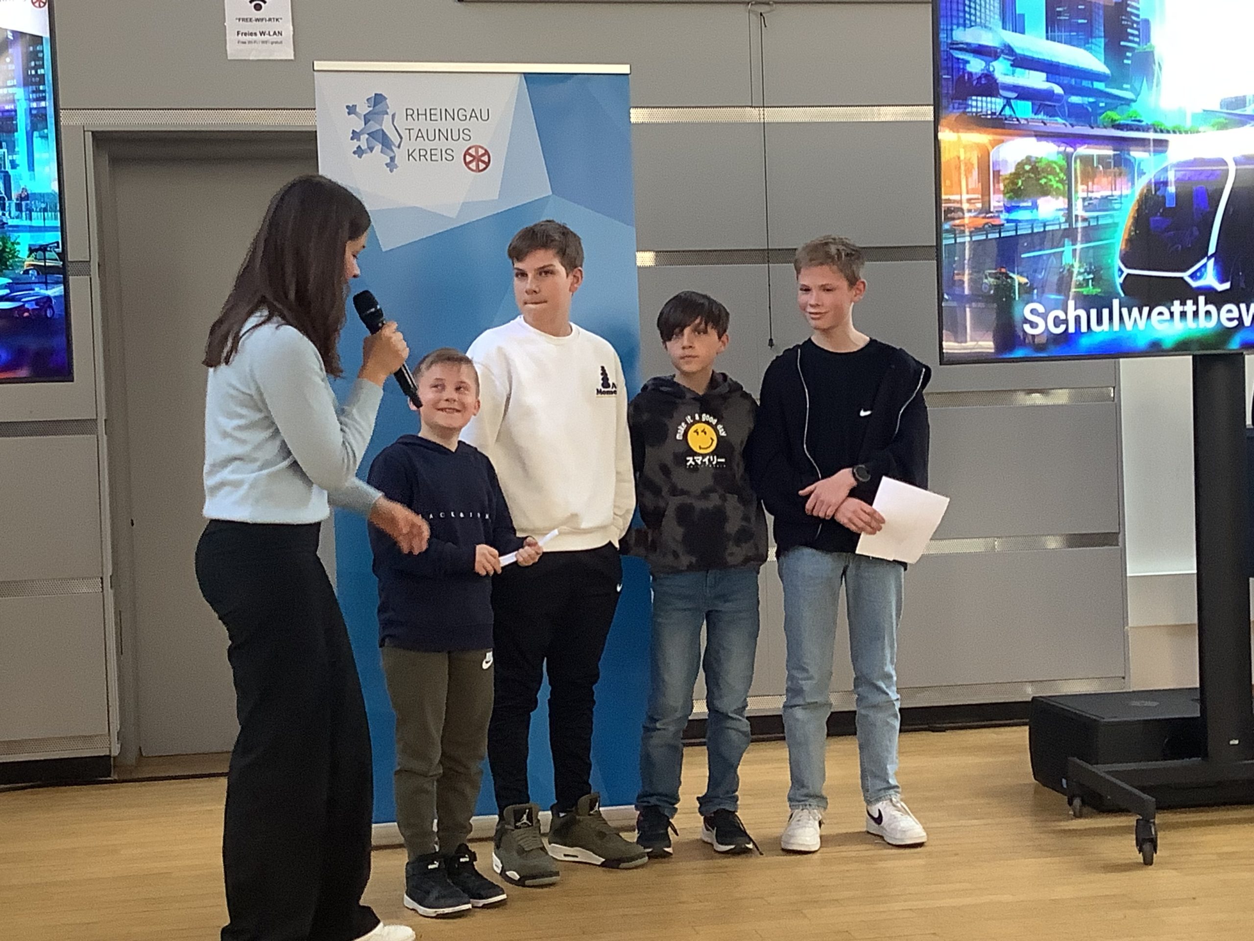 Denn erst beim dritten Anlauf konnte am 23.4. 24 die Siegerehrung für den Mobilitätswettbewerb des Rheingau-Taunus-Kreises stattfinden. Die ersten beiden Termine wurden wegen Schnee abgesagt. Außerdem wurden 4 Schüler aus der Klasse 6b mit dem 3. Platz prämiert.