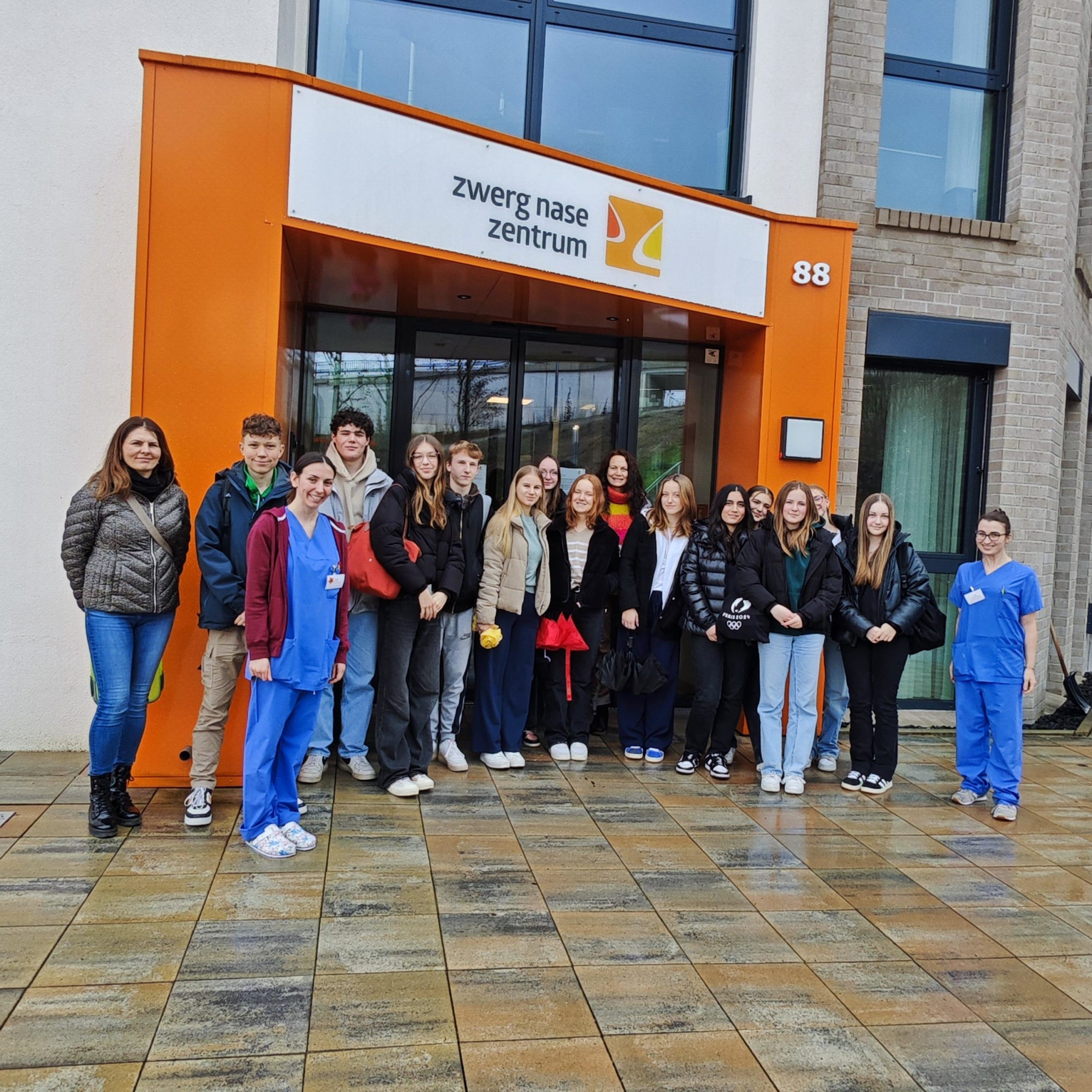 Am Montag, den 11.03.24 haben wir, der WPU-Kurs „Gesundheit und Soziales“ von Frau Stork der Klassenstufe 10, gemeinsam mit Frau Davydenko das „Zwerg Nase Zentrum“ in Wiesbaden-Dotzheim besucht. In dieser Pflegeeinrichtung werden Kinder und Jugendliche mit lebensverkürzenden Krankheiten rund um die Uhr betreut, versorgt und gefördert. Bei unserer Ankunft wurden wir sehr freundlich von zwei Pädagoginnen empfangen, die uns erste Fragen gestellt und beantwortet und uns einen Film zur Vorstellung des Zentrums gezeigt haben. Danach wurden wir durch die sechs Stationen auf drei Stockwerken geführt, die uns einen Einblick in den Alltag im „Zwerg Nase Zentrum“ gegeben hat, sowohl in den der Pfleger, Pädagogen etc. aber auch in den der Bewohner. Anschließend haben wir in 2 Gruppen mit den Bewohnern Ostereier bemalt oder auch einfach nur geredet und den ein oder anderen kleinen Spaß gemacht. Für viele von uns war dies der erste Kontakt zu teilweise mehrfach behinderten Kindern und Jugendlichen.