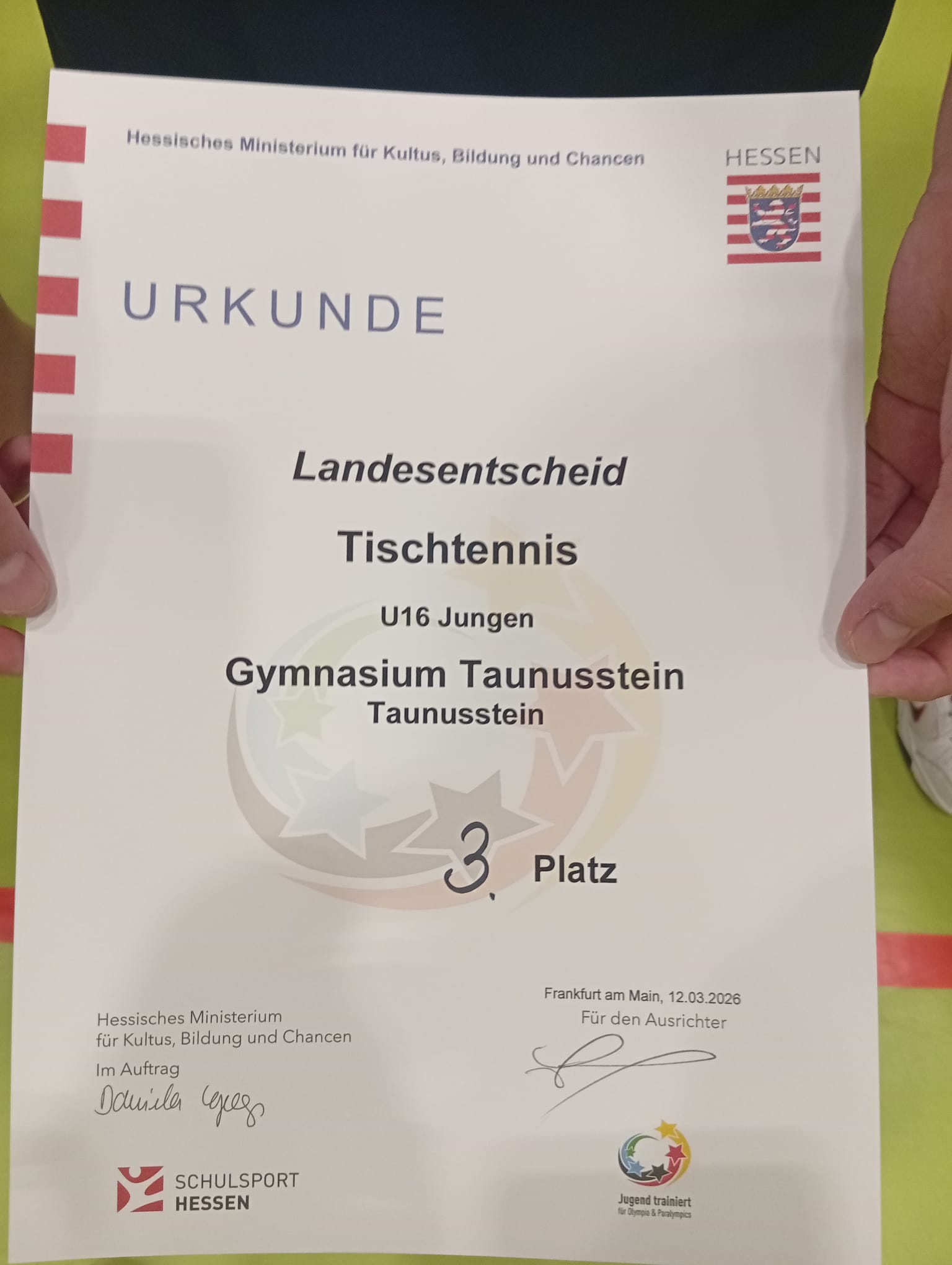 Über die Schulamtsentscheide (WI/RTK) im Herbst und die Regionalentscheide (F / MTK/ WI) imWinter hatten wir uns hierher qualifiziert. Hessens acht stärkste Schulen der unter 16-jahrigen aufgeteilt in zwei Gruppen. Die Gruppenphase überstanden wir souverän und standen im Halbfinale der Sportschule Carl von Weinberg Frankfurt a. M. gegenüber und unterlagen dem späteren Turniersieger.