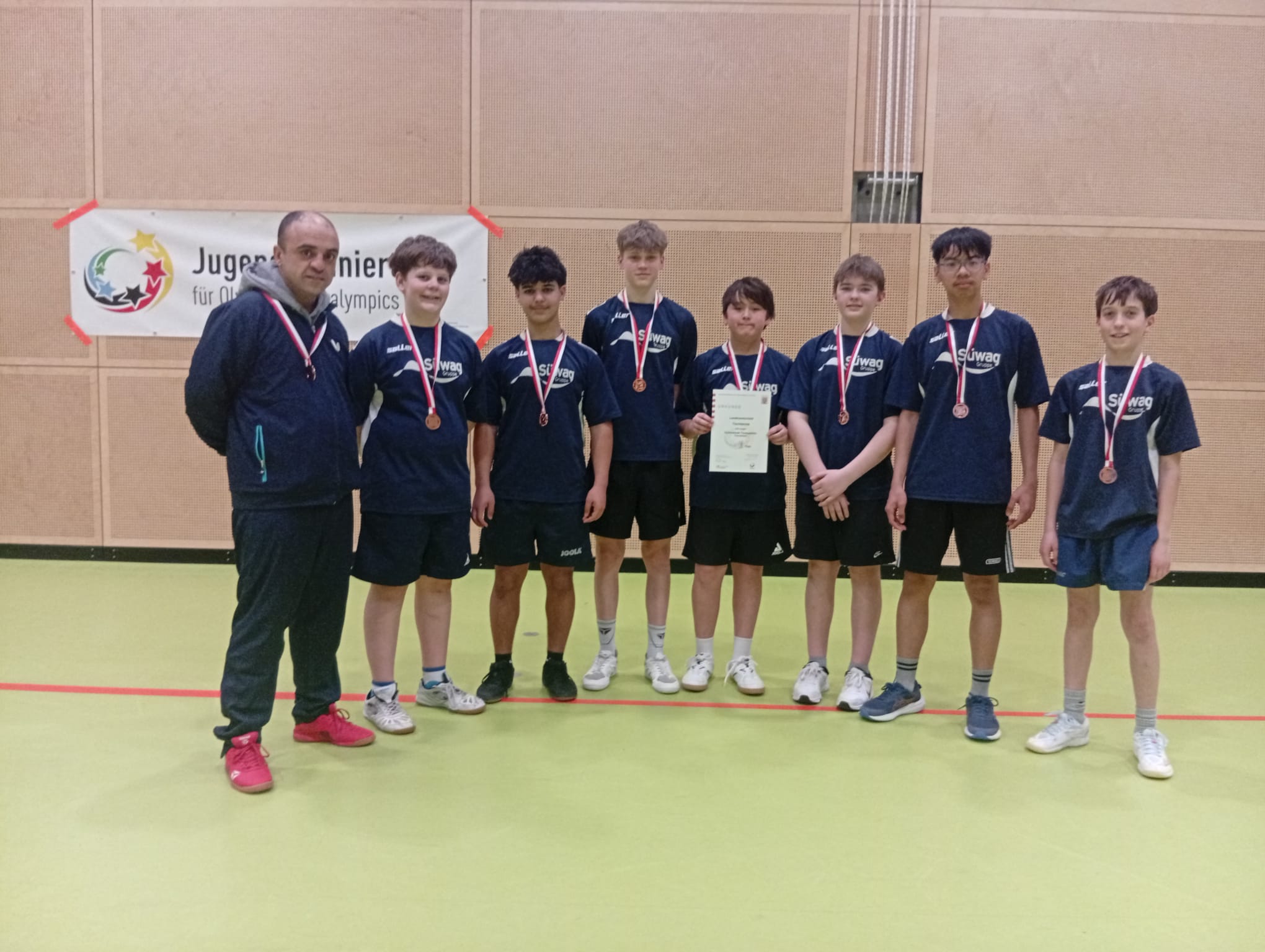 In einem packenden und spannenden Spiel um Platz 3 konnten wir uns gegen die Rabanus-Maurus-Schule aus Fulda mit einem knappen aber am Ende verdienten 5:4 durchsetzen. Nach den Doppel- und Einzelbegegnungen stand es 4:4 und es musste das Entscheidungsdoppel gespielt werden. Hier bewiesen Noah & Sem ihre Nerven aus Drahtseil und bescherten ihren Mannschaftskollegen eine Medaille zur Urkunde.