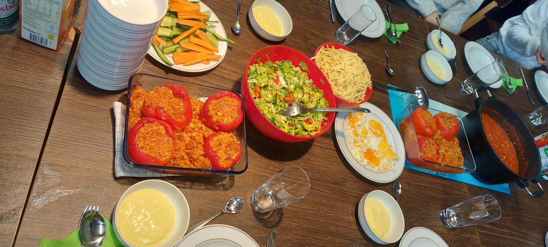 Das Ergebnis konnte sich sehen und essen lassen: Gefüllte Paprika, Spätzle mit einer Tomaten-Gemüsesauce und Salat.