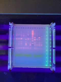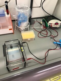 Unter der Elektrophorese versteht man im übertragenen Sinne ein Wettrennen zwischen schon fertig geschnittenen DNA-Fragmenten (,die bei jedem Menschen verschieden sind), die auf dem sogenannten Agarosegel durch eine angelegte Spannung von ihrer Ladung angetrieben werden und sich durch den Widerstand nach ihrer Länge und Größe ordnen. Diese Ordnung kann man sichtbar werden lassen und vergleichen.