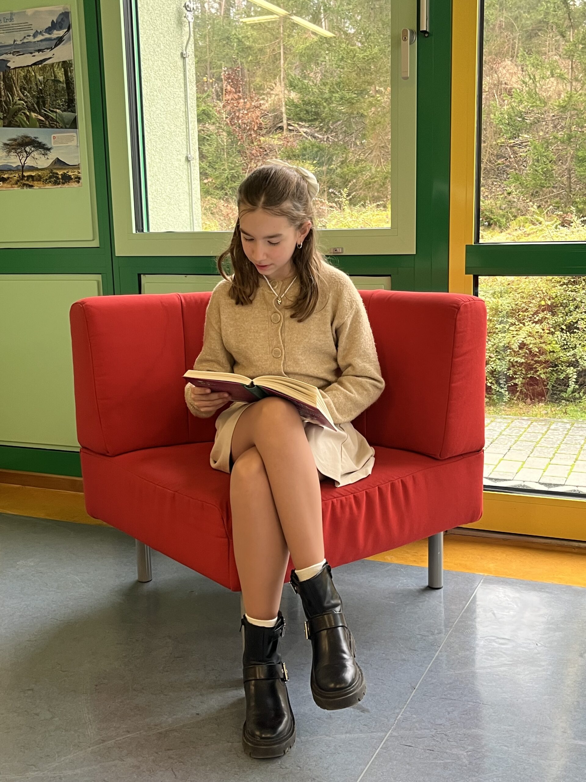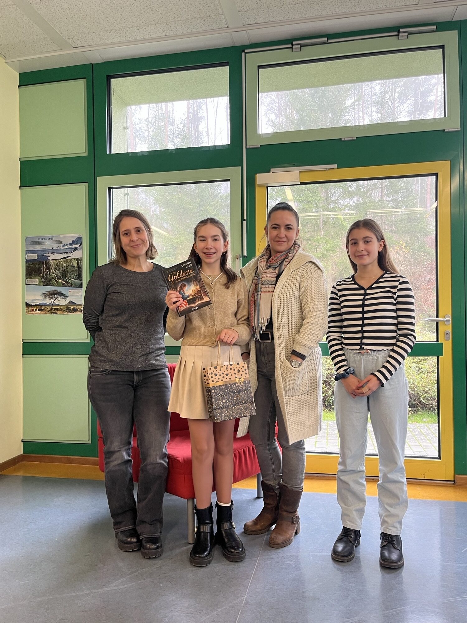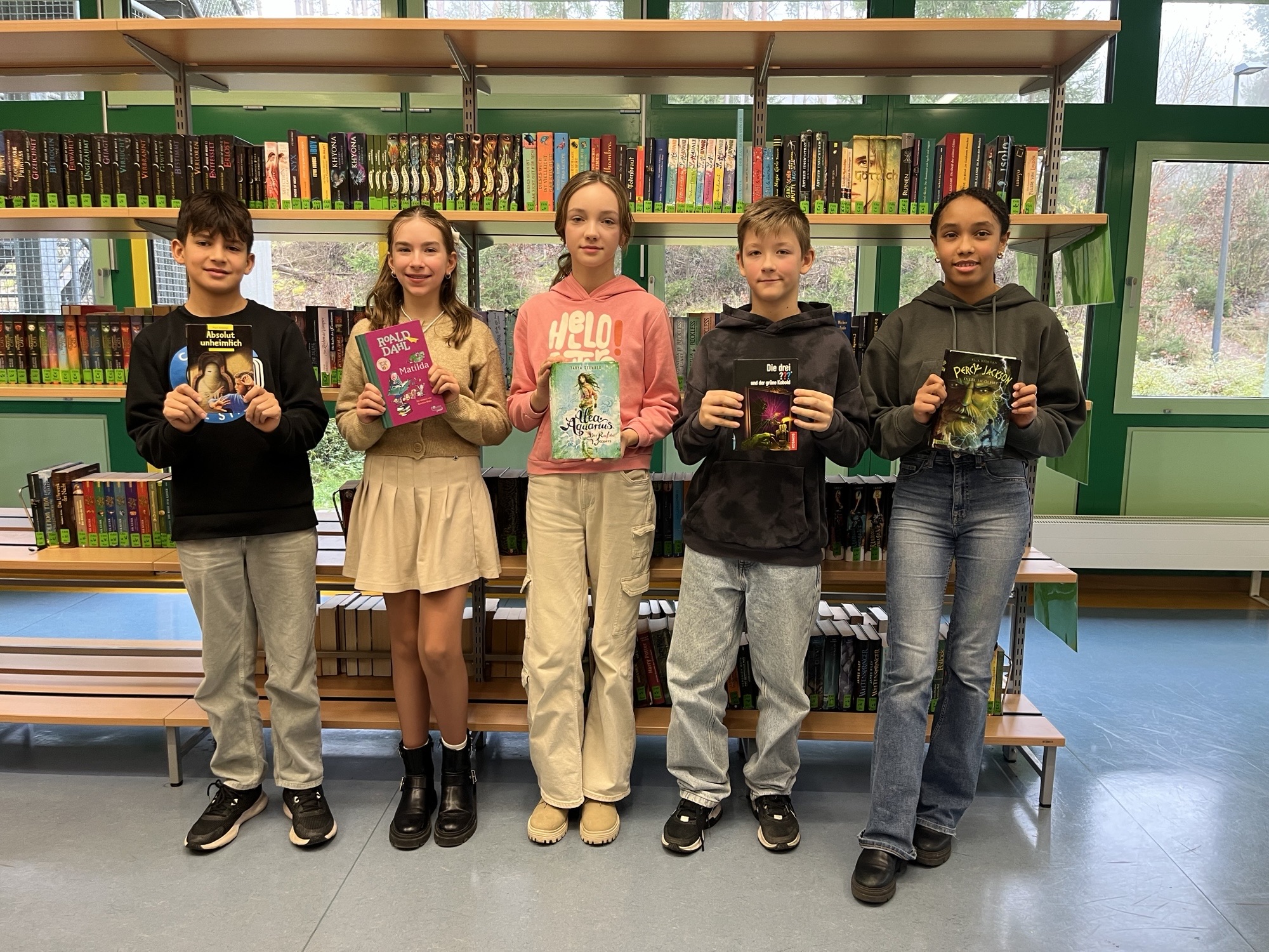 Auch in diesem Jahr war die Schulbibliothek wieder Schauplatz eines ganz besonderen Ereignisses: Dort fand am 05.12.2024 der Vorlesewettbewerb der 6. Klassen statt. Die fünf Klassensiegerinnen und -sieger lasen für eine gespannte Runde aus Jury und unterstützenden Kindern aus fünf mitgebrachten Kinder- und Jugendromanen vor. Allen gemeinsam waren fantastische, geheimnisvolle und zauberhafte Momente, die von den Vorlesenden stimmungsvoll und lebendig vorgetragen wurden. Nach vielen tollen Leseleistungen konnte Ava Biris aus der 6b den Wettbewerb für sich entscheiden und kommt damit in die nächste Runde, den Regionalentscheid. Sie erfreute das Publikum mit einer lustigen Passage aus dem Buch „Matilda“ von Roald Dahl und wurde für ihre souveränen Präsentationen – auch des ungeübten Textes aus dem Fantasy-Roman „Der goldene Kompass“ von Philip Pullman – mit dem Buch „Die goldene Schreibmaschine“ von Carsten Henn (noch eine magische Geschichte) als Preis belohnt. Diesen wie auch die Anerkennungspreise für die anderen Kinder spendete Frau Nickel von Papier, Bücher und Geschenke Ellinger, die neben der Vorjahressiegerin Lina Zehner, Frau Guntrum für die Schulleitung und Frau Schulz als Vorsitzende des Faches Deutsch in der Jury saß. Im kommenden Schuljahr darf Ava sich dann auf einen Platz in der Jury freuen. Aber auch die anderen Kinder (Noemi Groothold 6a, Haroun Akhouaji 6c, Levi Wenzl 6d und Marlene Ahmelt 6e) sorgten für aufregende und unterhaltsame Momente – es hat großen Spaß gemacht, allen Kindern beim Vorlesen zuzuhören.