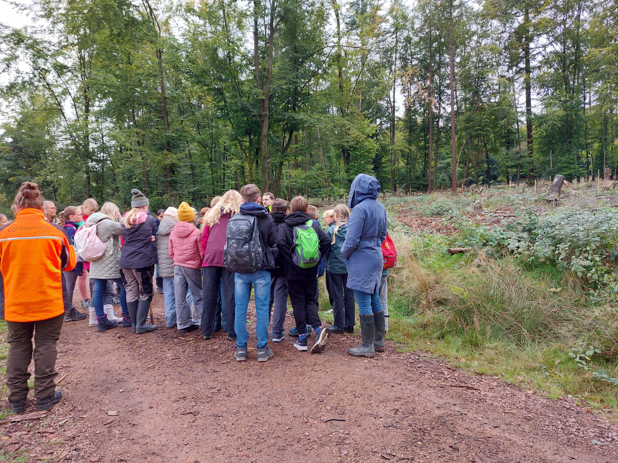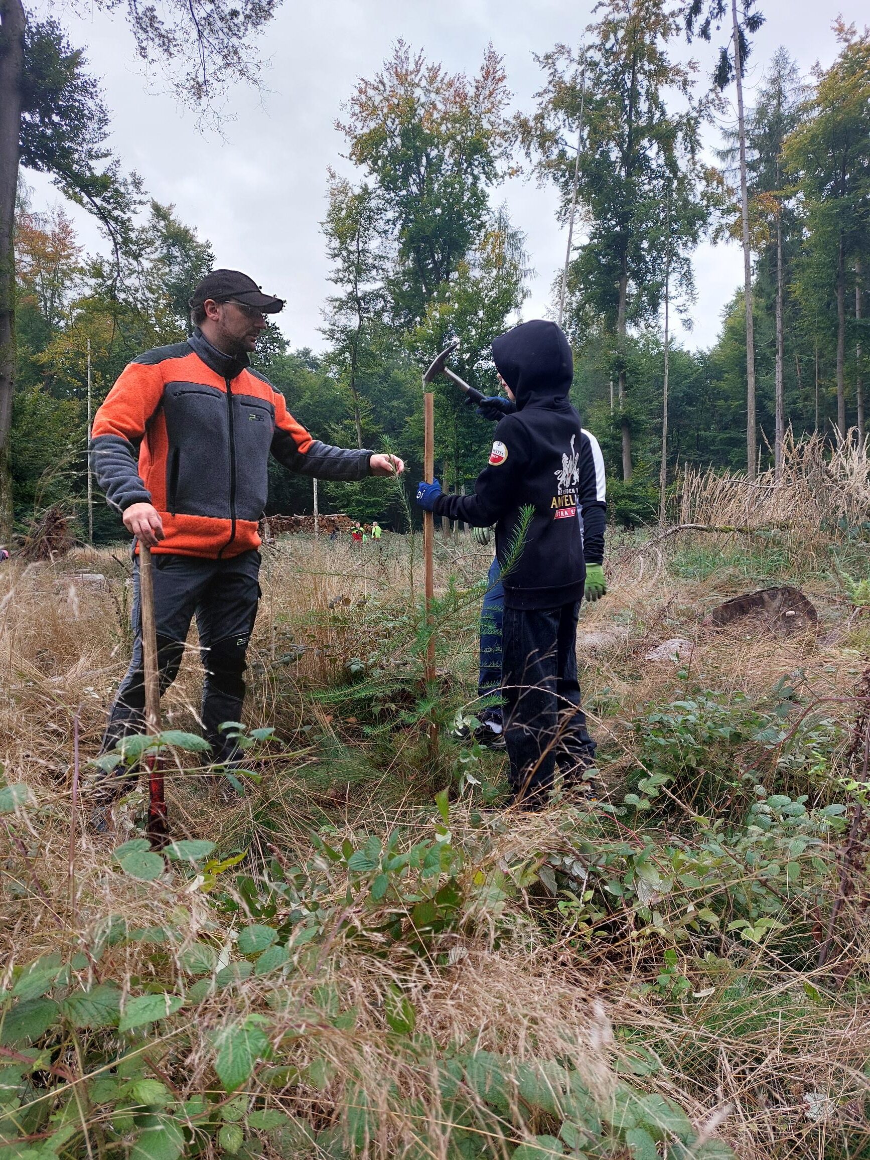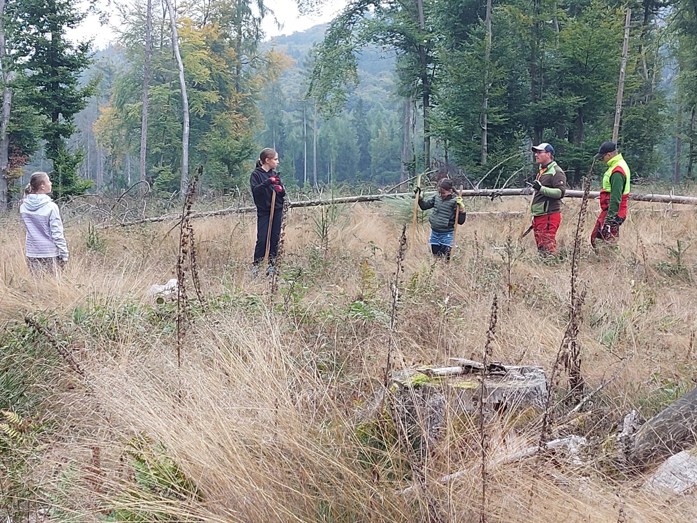 In den vergangenen Jahren haben unsere Schülerinnen und Schüler Bäume gepflanzt. Das hat auch viel Spaß gemacht. Aber die Verantwortlichen für den Stadtwald haben uns erklärt, dass in einem Dauerwald die Naturverjüngung den Vorrang hat. Zudem braucht ein Dauerwald nicht nur neue Bäume, sondern auch Pflege.