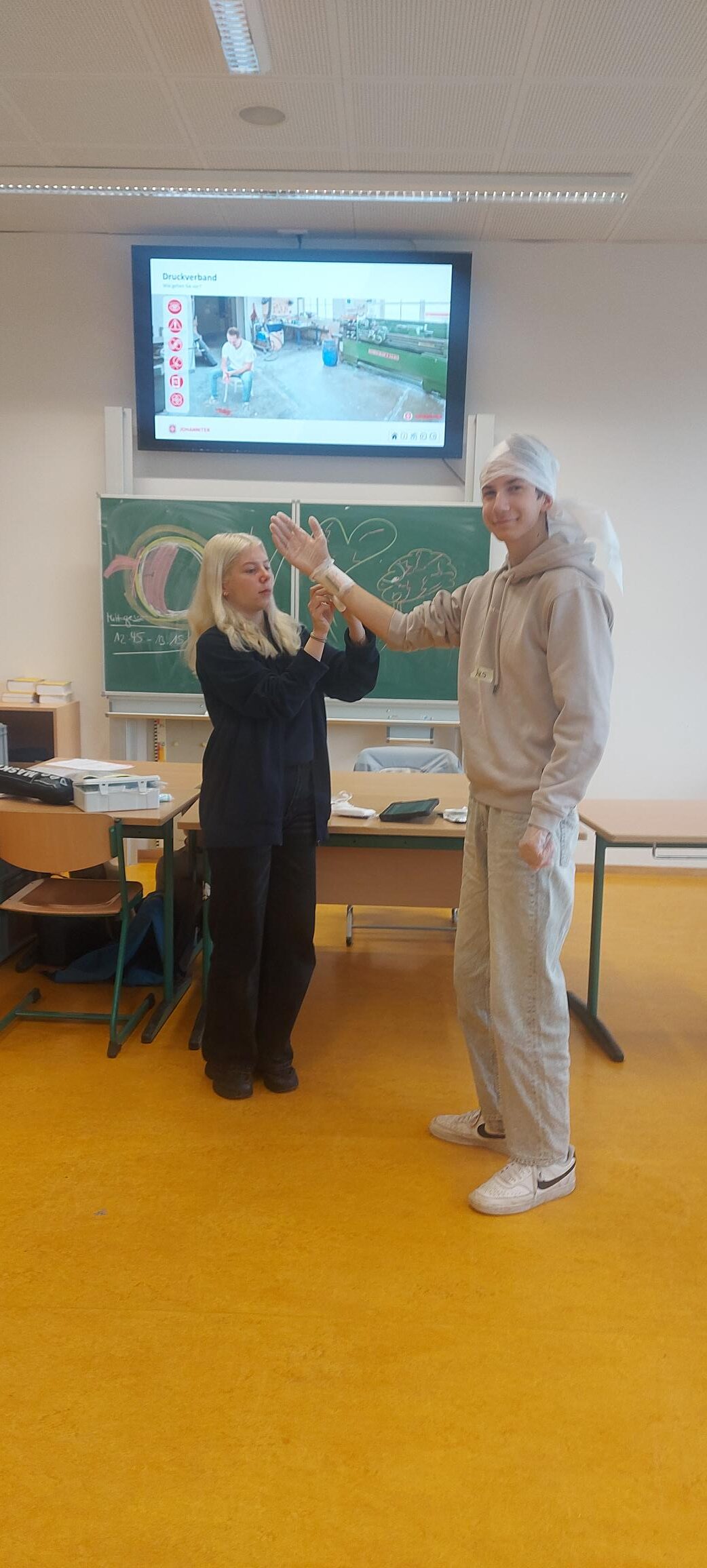 Die Erste-Hilfe-Ausbildung wurde von einer ausgebildeten Trainerin der Johanniter Unfallhilfe e.V. direkt in der Schule durchgeführt. Für Chantal war es eine besondere Schulung, fand sie doch an ihrer eigenen ehemaligen Schule statt.