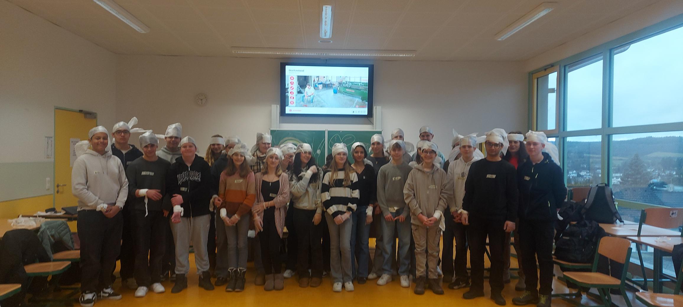 Die Schülerinnen und Schüler des 9. Jahrgangs des Gymnasiums Taunusstein haben einen Erste-Hilfe-Kurs absolviert. Mit viel Engagement und Spaß wurden Verbände, stabile Seitenlage und Herz-Lungen-Wiederbelebung geübt. Hilfsbereitschaft und Verantwortungsgefühl wurden ebenso vermittelt wie Hinweise zur Gefahrenmeidung und zum Selbstschutz und natürlich das richtige Handeln im Notfall.