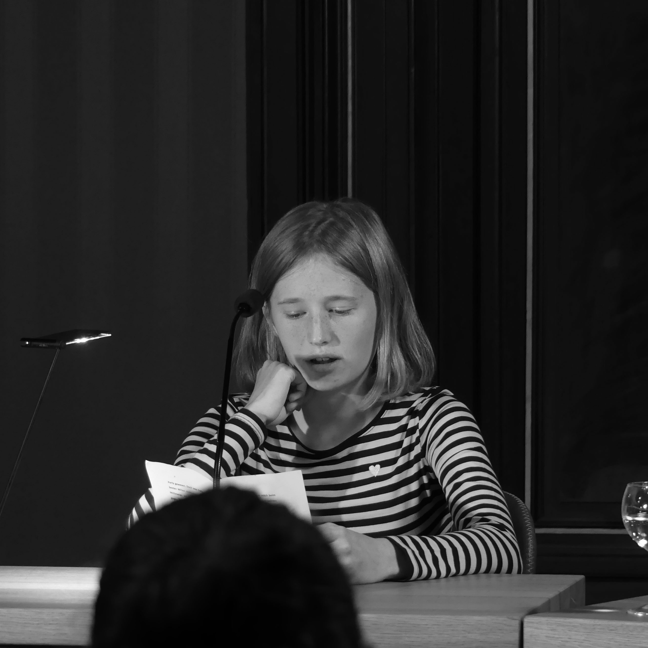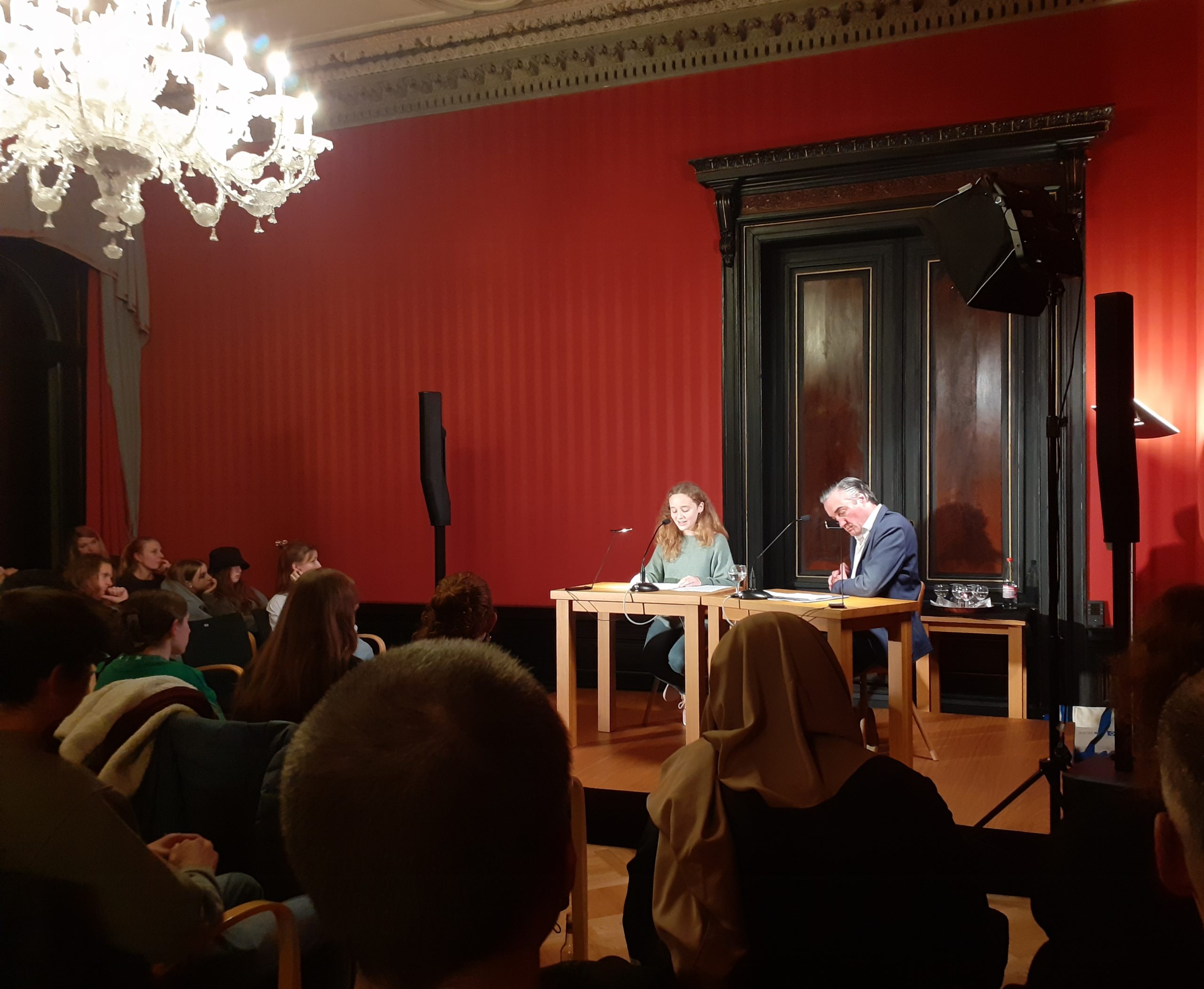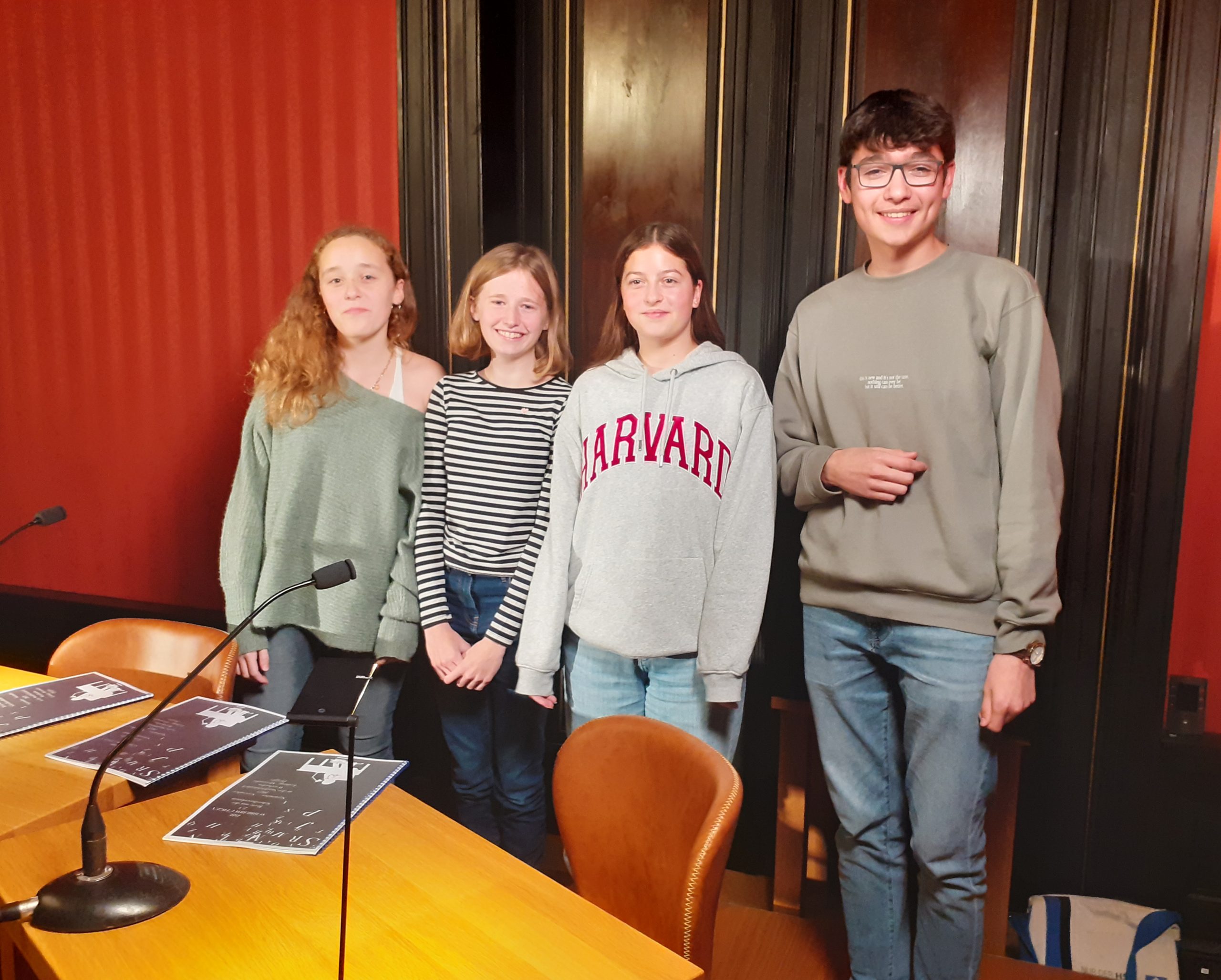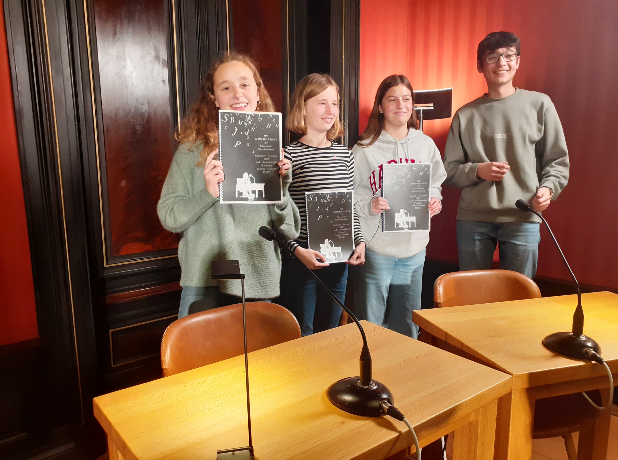 Sophie Galler, Johanna Nowak, Nina Skulesch aus der 8d (Frau Schulz) und Mahmoud Hamad aus der 8e (Herr Ruckes) trugen bei der Veranstaltung ihre selbstverfassten Geschichten vor, nachdem sie seit September regelmäßig an den Treffen der Schreibwerkstatt des Wiesbadener Schriftstellers Alexander Pfeiffer (https://www.alexanderpfeiffer.de/service/schreibwerkstaetten/) teilgenommen hatten. In dieser Zeit tauschten sie sich über ihre Schreiberfahrungen aus und feilten immer weiter an ihren Texten, die im gut besuchten Literaturhaus Wiesbaden für viel Beifall sorgten. Wir gratulieren herzlich!