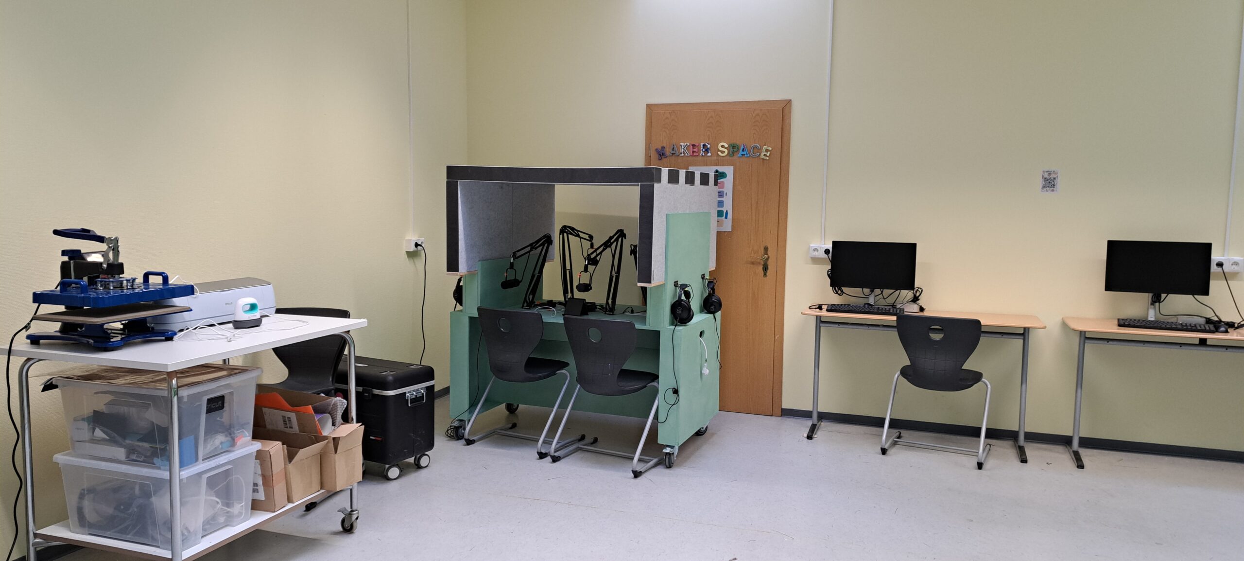 Der Maker Space ist weit mehr als ein zusätzlicher Fachraum. Er ist ein Ort, an dem Ideen wachsen, Technik lebendig wird und Lernen unmittelbar erfahrbar ist. Ausgestattet mit modernster Digital- und Medientechnik wie 3D-Druckern, Plottern, Lasercuttern, Robotic-Equipment, Greenscreen, Audio- und Videotechnik sowie flexiblen Studioelementen bietet der Raum optimale Voraussetzungen für kreatives Arbeiten in allen Jahrgängen. Schülerinnen und Schüler nutzen diese Ausstattung für unterschiedlichste Projekte: Sie konstruieren 3D-Modelle und drucken sie aus, produzieren Audiodateien wie Podcasts oder Interviews, erstellen Videos mit professionellem Licht und Ton, programmieren Robotik-Modelle oder gestalten Medienprodukte im Rahmen von Kunst-, MINT-, gesellschaftswissenschaftlichem oder fremdsprachlichem Unterricht.