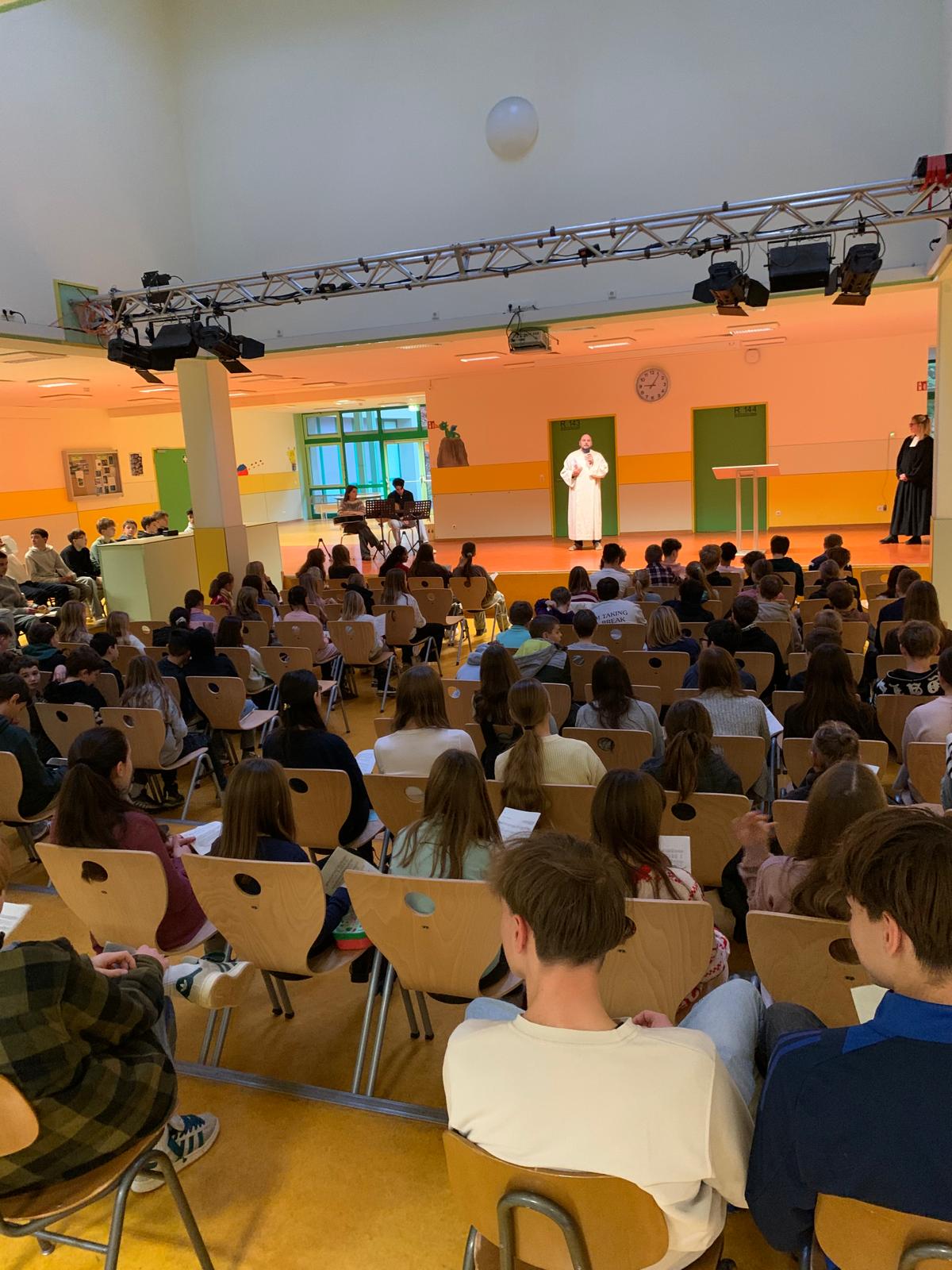 Am 19.12.25 fand in der 2. Stunde der jährliche Schulgottesdienst zu Weihnachten statt und er wurde von Pfarrerin Anna Grundhöfer und Pastoralreferent Tobias Schirmer geleitet.
