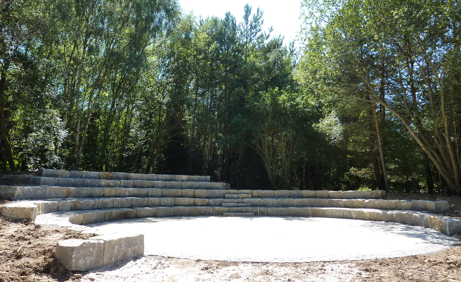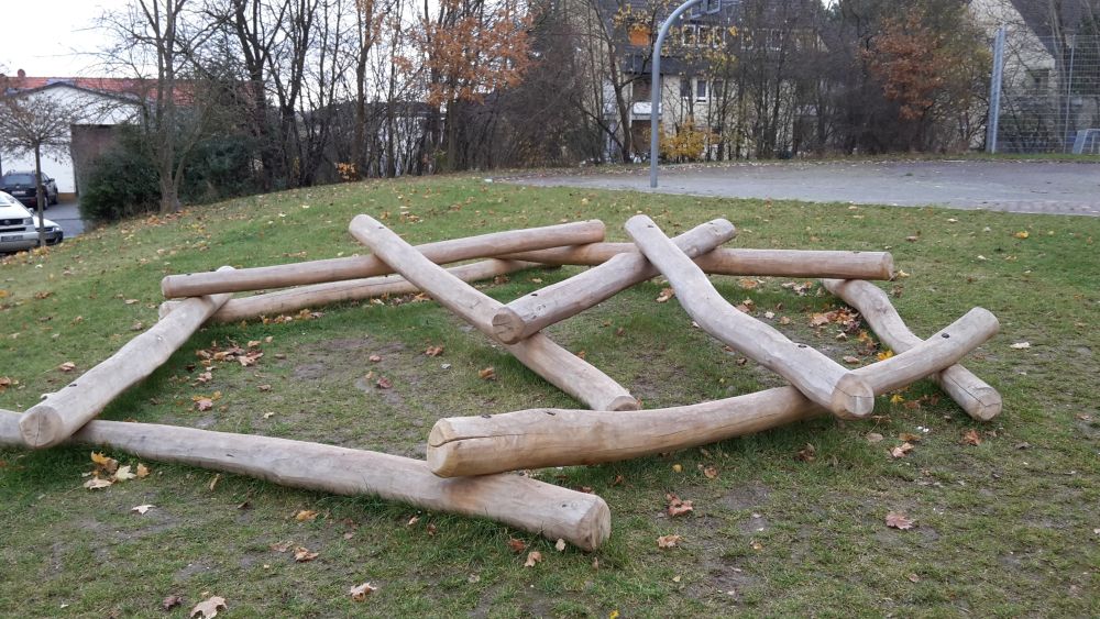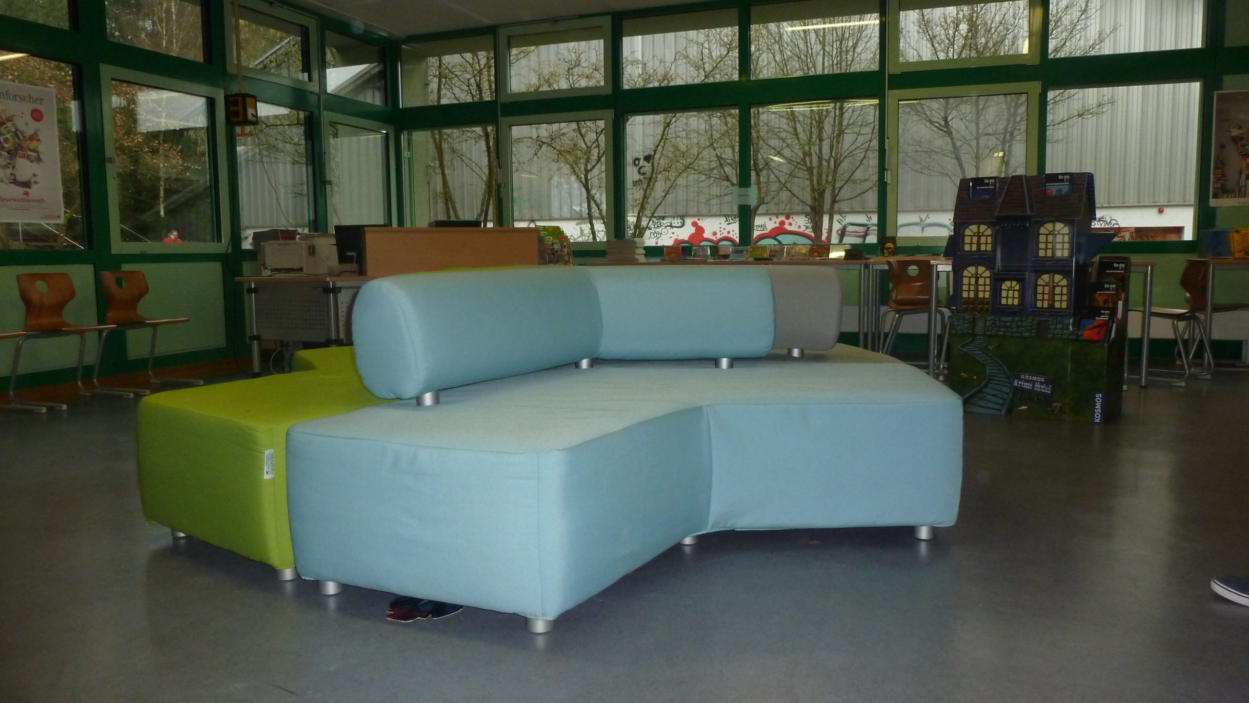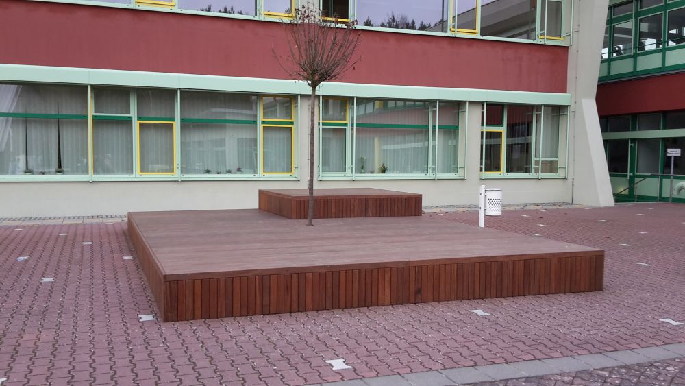 Holz-Podest, Pausenbank, Liegebank, Balance-Äste, Aufbewahrungscontainer für die Sitzkissen etc. für das Amphitheater, Amphitheater, Chill-Sofa im Silentium