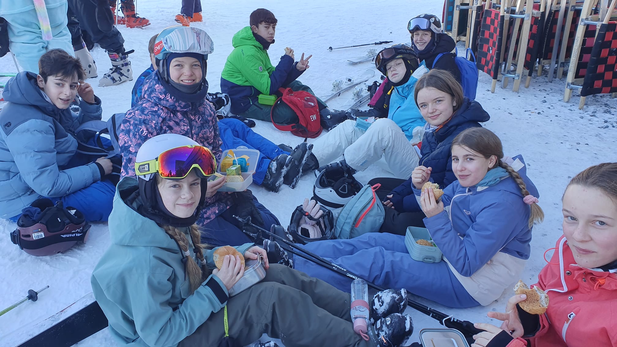 Nach der Mittagspause war es dann soweit: In kleinen, selbstorganisierten Gruppen durften die Schülerinnen und Schüler eigenständig auf einer abgesprochenen Piste fahren. Dies gab ihnen die Möglichkeit, das Erlernte eigenverantwortlich anzuwenden und noch mehr Selbstvertrauen auf der Piste zu gewinnen. Besonders erfreulich war, wie gut die Schülerinnen und Schüler sich unabhängig von ihrem Können unterstützten. Sie achteten aufeinander, halfen sich gegenseitig und sorgten dafür, dass niemand zurückblieb.
