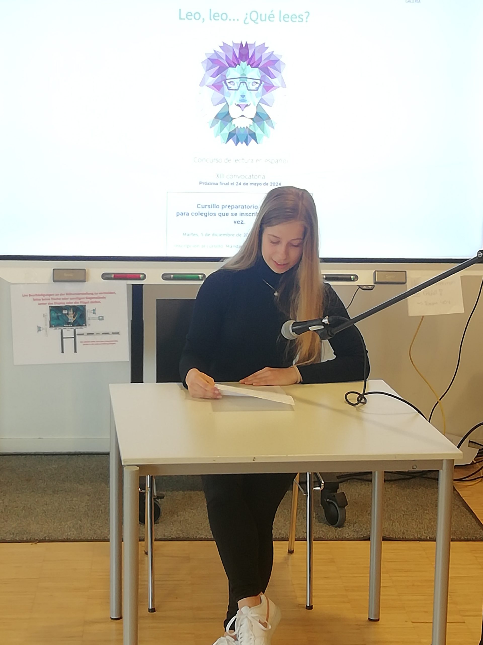 Nach einem schulinternen Vorentscheid ging es für die gekürten Schulsiegerinnen Julia Retzlav aus der E-Phase (für das Niveau B1) und Flavia Taus aus dem Jahrgang 9 (für das Niveau A1) am 19.4.2024 an das Neue Gymnasium in Rüsselsheim. Hier trafen sich die VertreterInnen von weiteren 8 Schulen der Region, um einen Platz beim großen Finale am ‚Instituto Cervantes‘ in Frankfurt zu ergattern.