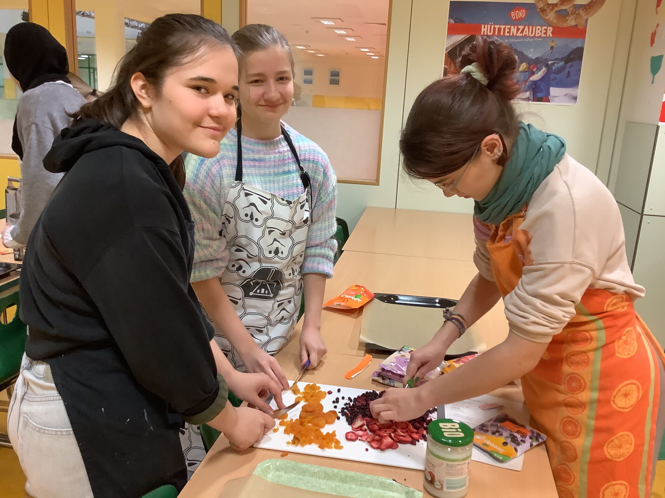 Gemäß ihres Mottos „fit4life“ hat der WPU Kurs des Jahrgangs 9 unter Leitung von Frau Stork heute Plätzchen gebacken: Mit Trockenfrüchten und Honig statt Zucker, Vollkornmehl und gemahlenen Nüssen.